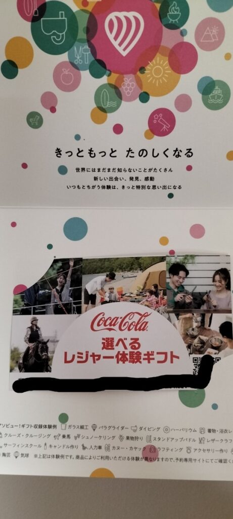 色々な体験から1つ選べ、日帰り温泉や、室内型遊園地入場券のようなものがありました。