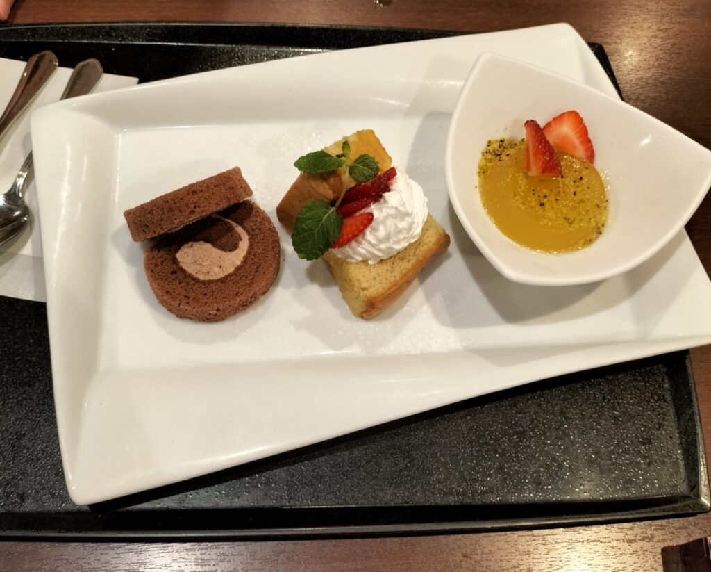 みかんゼリーとシフォンケーキ、ショコラケーキの3種盛り。