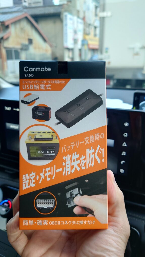 メモリー保護のため、OBD2ポートにメモリーキーパーを接続、車内の電子機器に電源を供給しておきます。