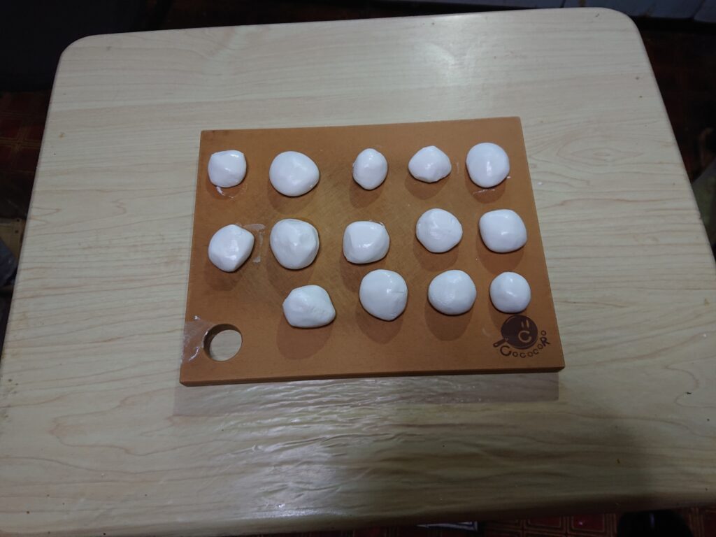 指定量の水を加えて混ぜて、ひたすら丸めていきます。