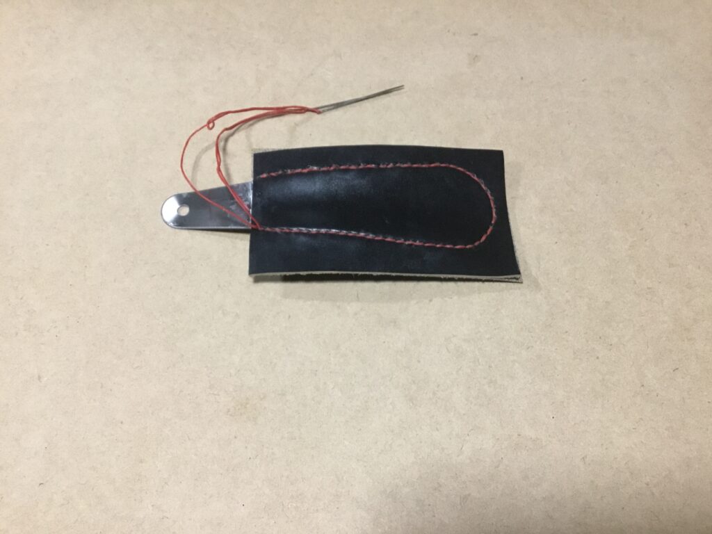 通常は型紙などを作って革を切り出してから縫うのですが、今回は先に貼り付けて、縫って、カットしました。