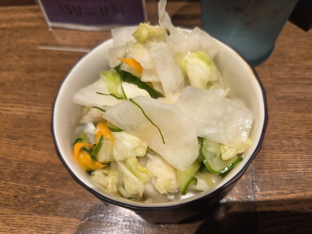 お通し。浅漬けのような感じであっさりして美味しい😋しかも、お代わり自由!