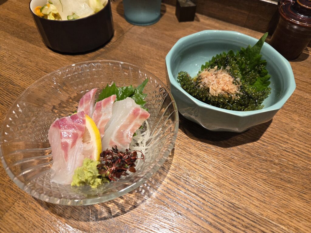 刺身の中ではいちばん好きな鯛のお造りと、大好きな海ぶどう。