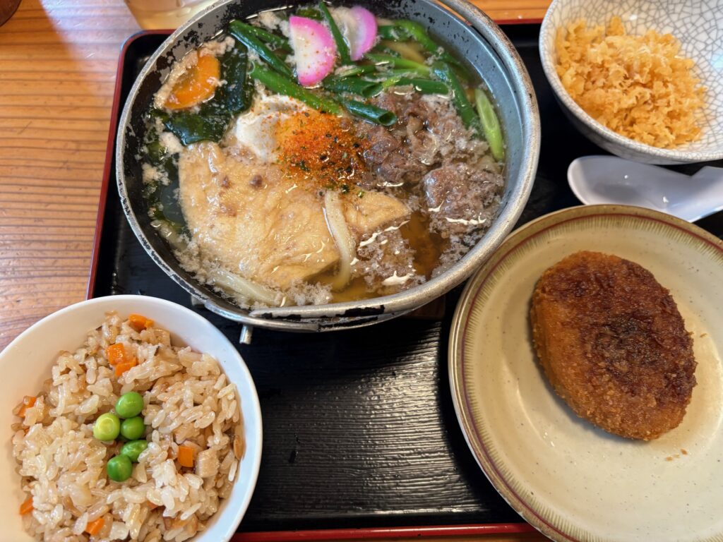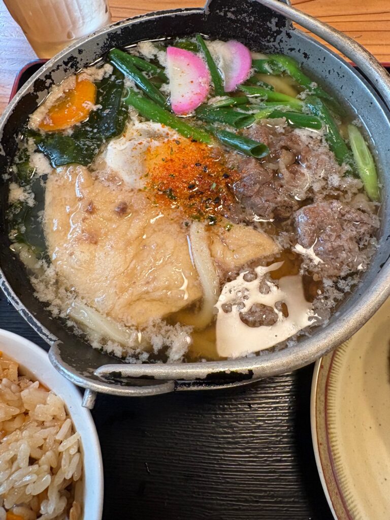 ここの鍋焼きうどんは香川県特有のもちもちした麺ではないのですが、出汁も甘めでかなり美味しいです。