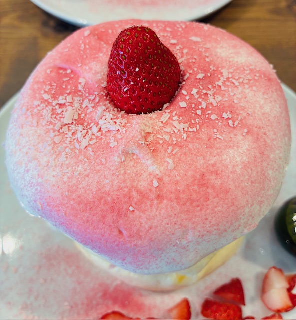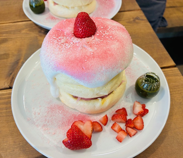 実際に運ばれてきたパンケーキは見た目もとても華やかで、上はふわふわのスフレ、その下にパンケーキが2段重なったボリュームのある一皿でした。間には桜あんが入っていて、ほんのり春を感じるやさしい甘さが印象的です。