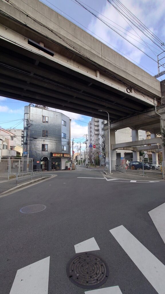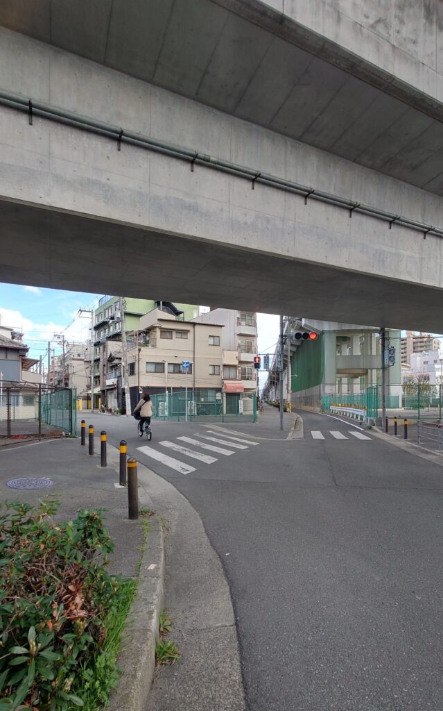 阪神高速松原線の高架下を南へ折れます。