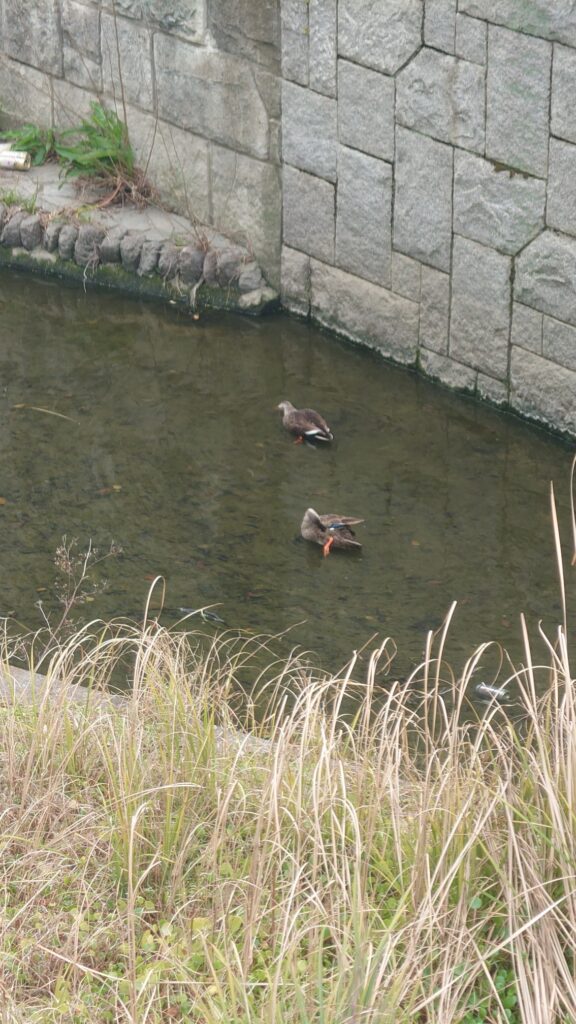 横の川では鴨が水浴びをしています。