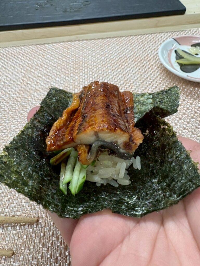 十一品目は、あたたかいうなぎの手巻き寿司。